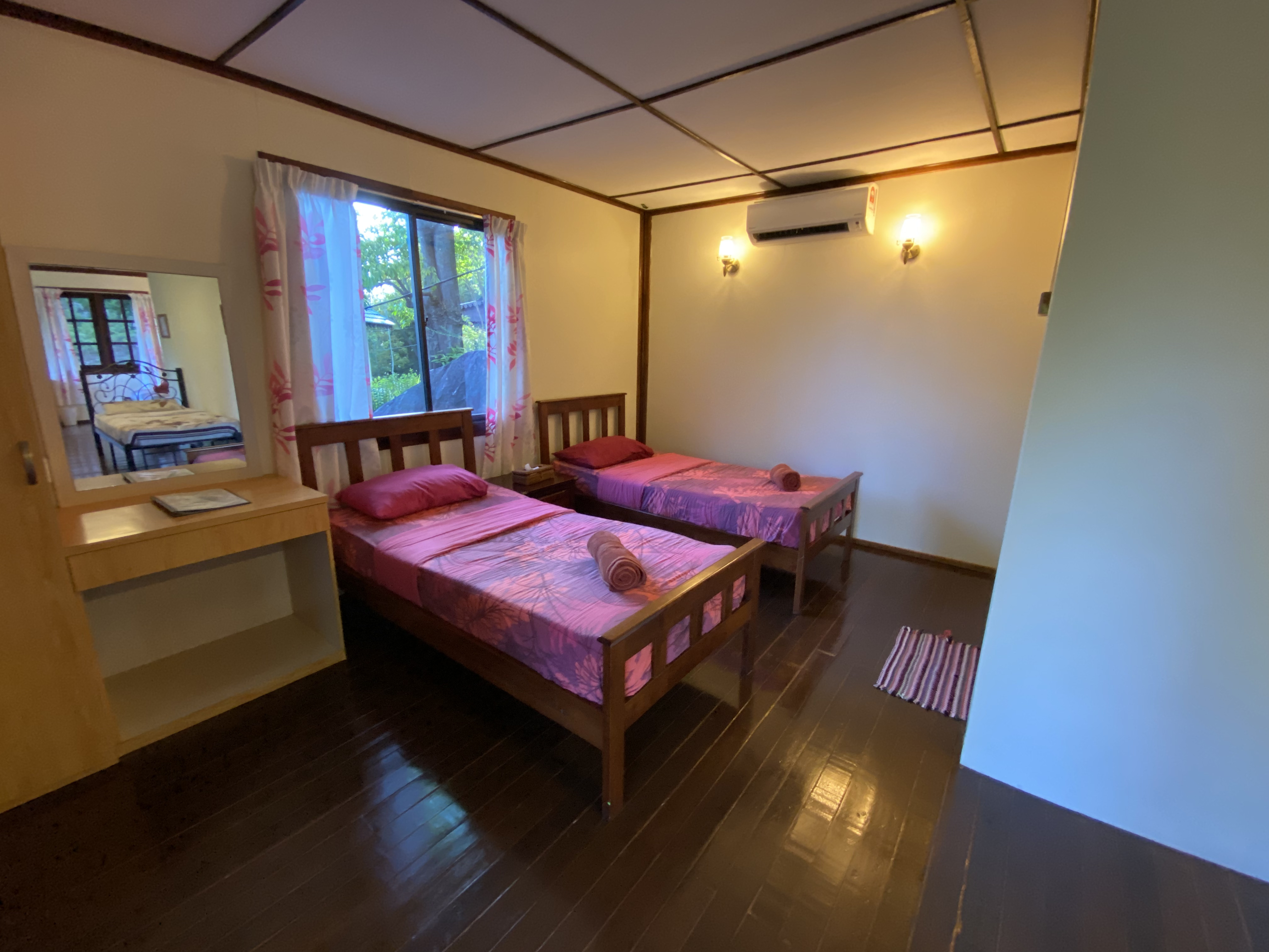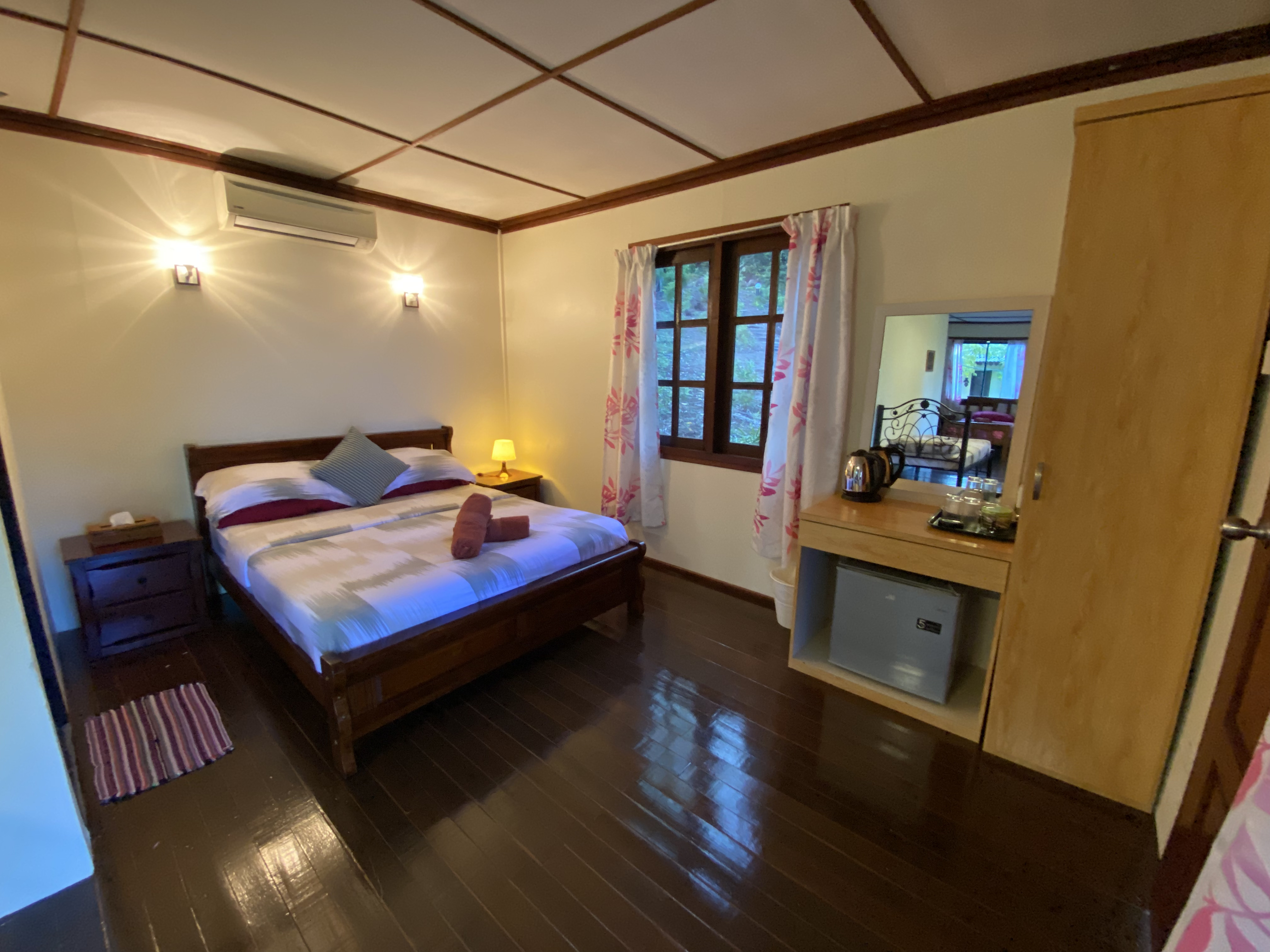 The Minang Family Cabin is a comfortable air conditioned, en-suite single story cabin, built to traditional styling with local wooden flooring and wooden furnitures. The rooms are spacious and include their own veranda with stunning views of the cove. Each family cabin can sleep up to 5 people in comfort. Please advice us of your requirements when booking to ensure availability.